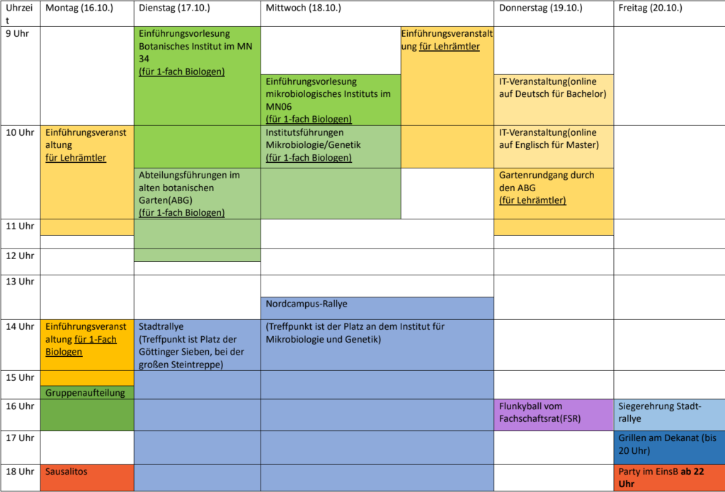 Dieser Abschnitt beinhaltet den Ablaufplan der O-Phase. Der Plan ist ab Start der O-Phase am 16.10.2023 fest, jedoch können Änderungen vorgenommen werden, falls es kurzfristige Ausfälle oder Abweichungen gibt. Wir versuchen aktuelle Änderungen direkt zu vermerken, daher schaue gerne hier vorbei, wenn du nicht genau weißt, wann etwas stattfindet!