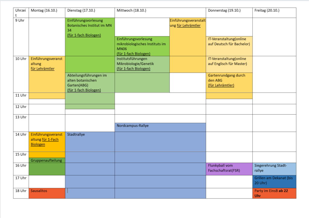 This section contains the schedule of the orientation week. The schedule is firm as of the start on 10/16/2023, but changes may be made if there are last-minute cancellations or deviations. We try to note current changes directly, so feel free to check back here if you don’t know exactly when something is taking place!